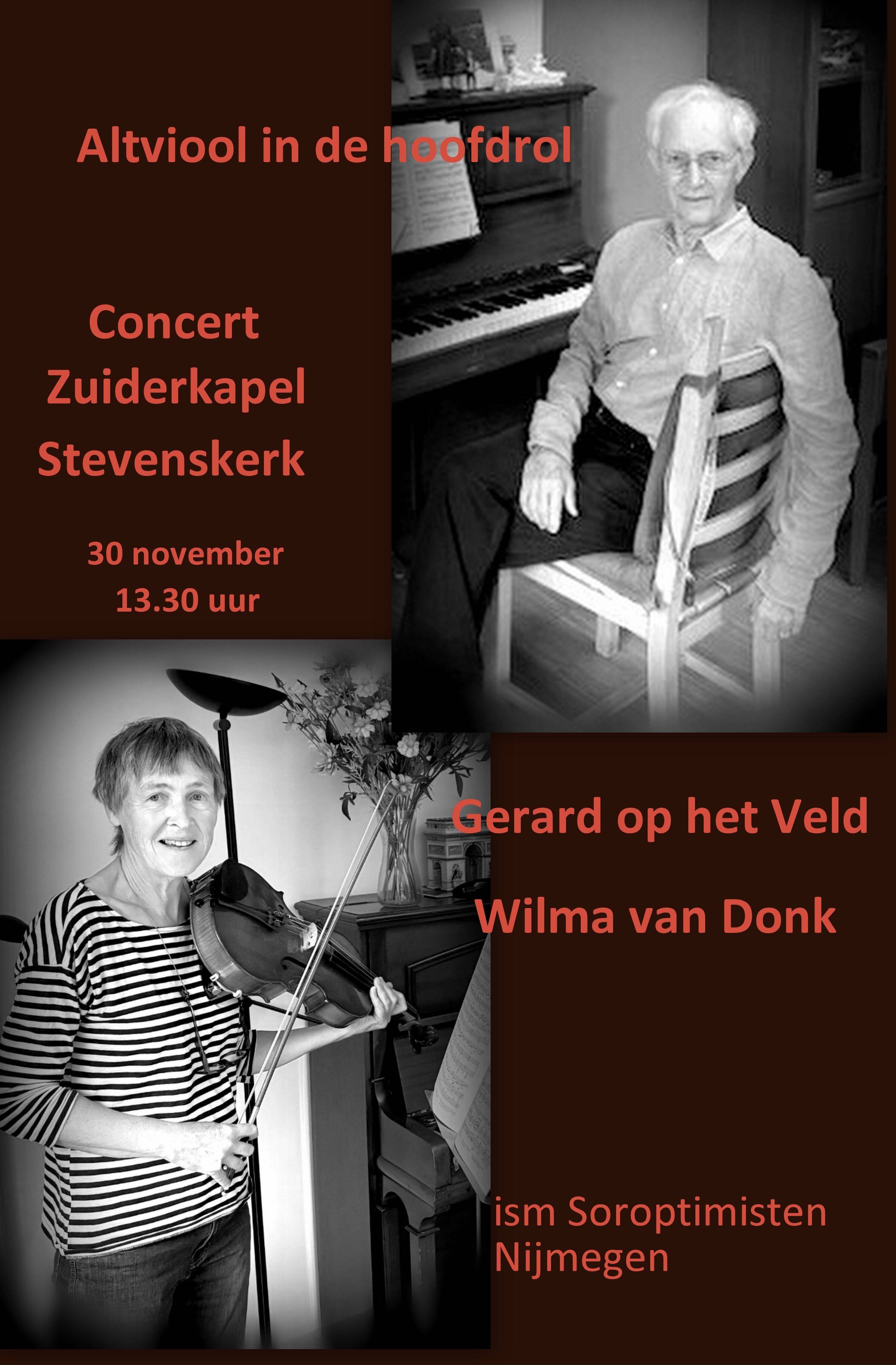 Telemann schreef als eerste stukken voor de altviool als solo-instrument. Hiervan staat een korte sonate op het programma. In de 19e eeuw werd de altviool populair als solo-instrument bij componisten als Schumann, Brahms, Hummel en Bruch. Uit deze periode laten wij de Romance van Bruch en een sonate van Brahms horen. Het timbre van de altviool past mooi bij de romantische muziek. Uit de 20e eeuw spelen wij Ravel’s "Une Piece en forme de Habanera" (1907). Er zijn uitvoeringen van voor viool, altviool en cello, maar wij vinden die voor altviool het mooist. Gerard op het Veld (piano) speelt piano vanaf 8 jarige leeftijd. Hij studeerde Franse taal- en letterkunde in Nijmegen met bijvak muziekwetenschappen en werd leraar Frans. Daarnaast was hij actief in het Nijmeegse muziekleven, onder meer als bestuurslid van de Stichting Kamermuziek en recensent bij de Gelderlander. Ook verzorgt hij sinds 2010 cursussen “Luisteren naar muziek”. Wilma van Donk (altviool) begon met vioolspelen op 10 jarige leeftijd. Zij studeerde wis- en natuurkunde in Groningen met als bijvak muziekgeschiedenis en stapte tijdens haar studententijd over op de altviool. Na haar studie werd Wilma docent wiskunde aan het Stedelijk Gymnasium in Nijmegen. Zij is lid van diverse orkesten (Autunno, Sequenza en het SON) en speelt daarnaast veel kamermuziek.