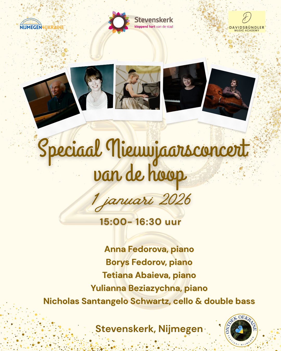 De uitvoering brengt een opmerkelijk ensemble van artiesten samen wiens passie en virtuositeit generaties en grenzen overstijgen. De internationaal geprezen pianiste Anna Fedorova, bekend om haar poëtische touch en diepe expressiviteit, treedt samen met haar vader, de vooraanstaande Oekraïense pianist Borys Fedorov, en haar moeder Tetiana Abaieva, op in een zeldzame verschijning die kunstzinnigheid en erfgoed verenigt. Op 11-jarige leeftijd maakt de rijzende ster en Davidsbündler Academist Yulianna Beziazychna al naam voor zichzelf als winnaar van talrijke internationale jeugdwedstrijden. Ondanks haar jonge leeftijd stralen haar optredens al zowel technische beheersing als emotionele diepgang uit. Deze bijzondere lijst wordt vervolledigd door Nicholas Santangelo Schwartz, lid van het Koninklijk Concertgebouworkest en een veelzijdige muziekdocent wiens rijke klankkleur op zowel cello als contrabas een unieke dimensie aan het programma toevoegt. Samen bieden deze artiesten een avond van krachtige samenwerking en oprechte muziekbeleving in solidariteit met Oekraïne.