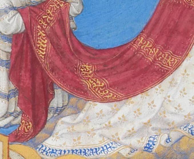 Gebroeders Van Lymborch, Gewaad met pseudo-Arabische inscripties, detail van De Kroning van de Maagd Maria uit Les Très Riches Heures, 1411/12-1416 (collectie Musée Condé, Chantilly)