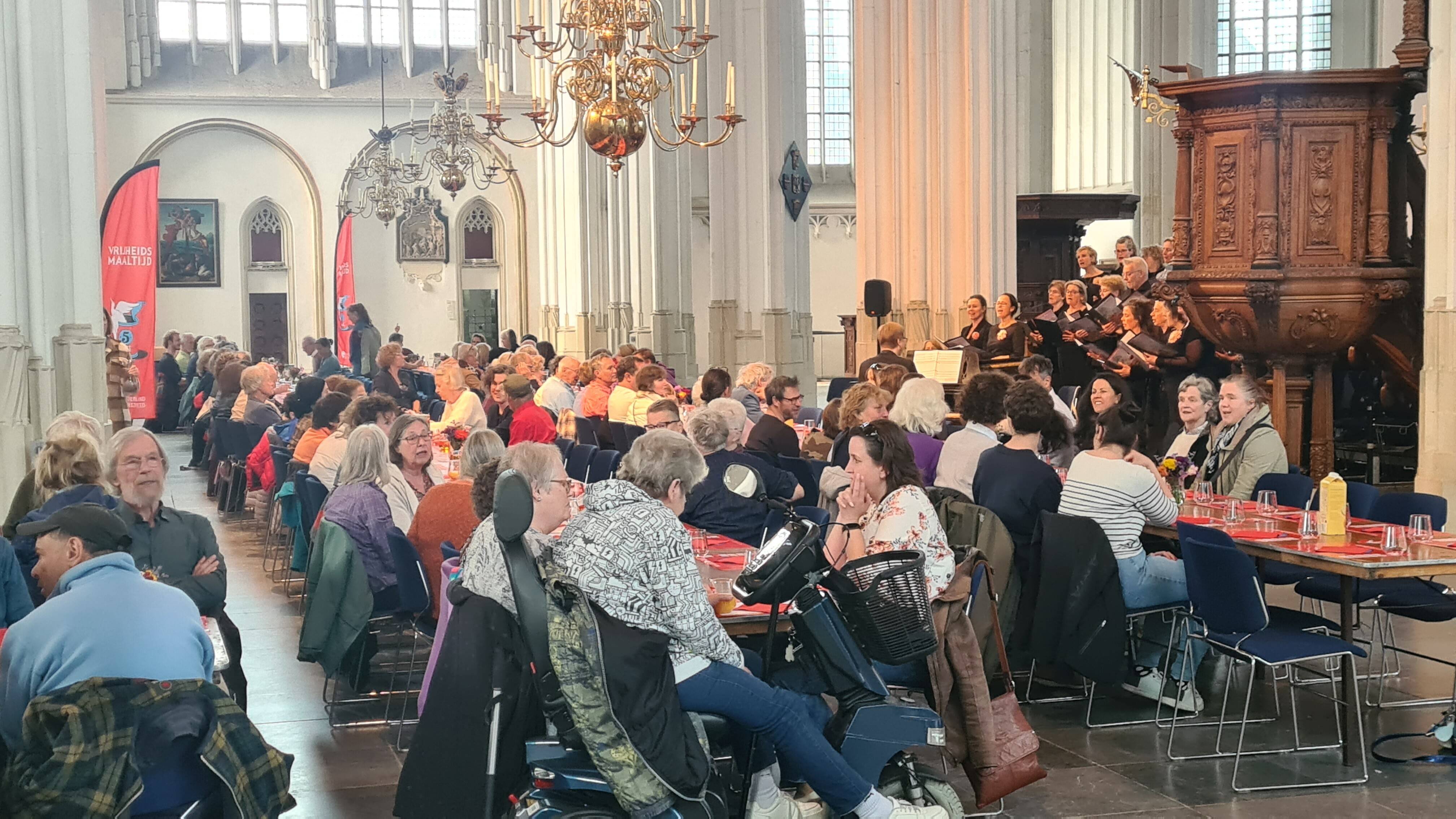 In de kerk staan lange tafels waaraan iedereen kan aanschuiven. Wel geldt: vol is vol.